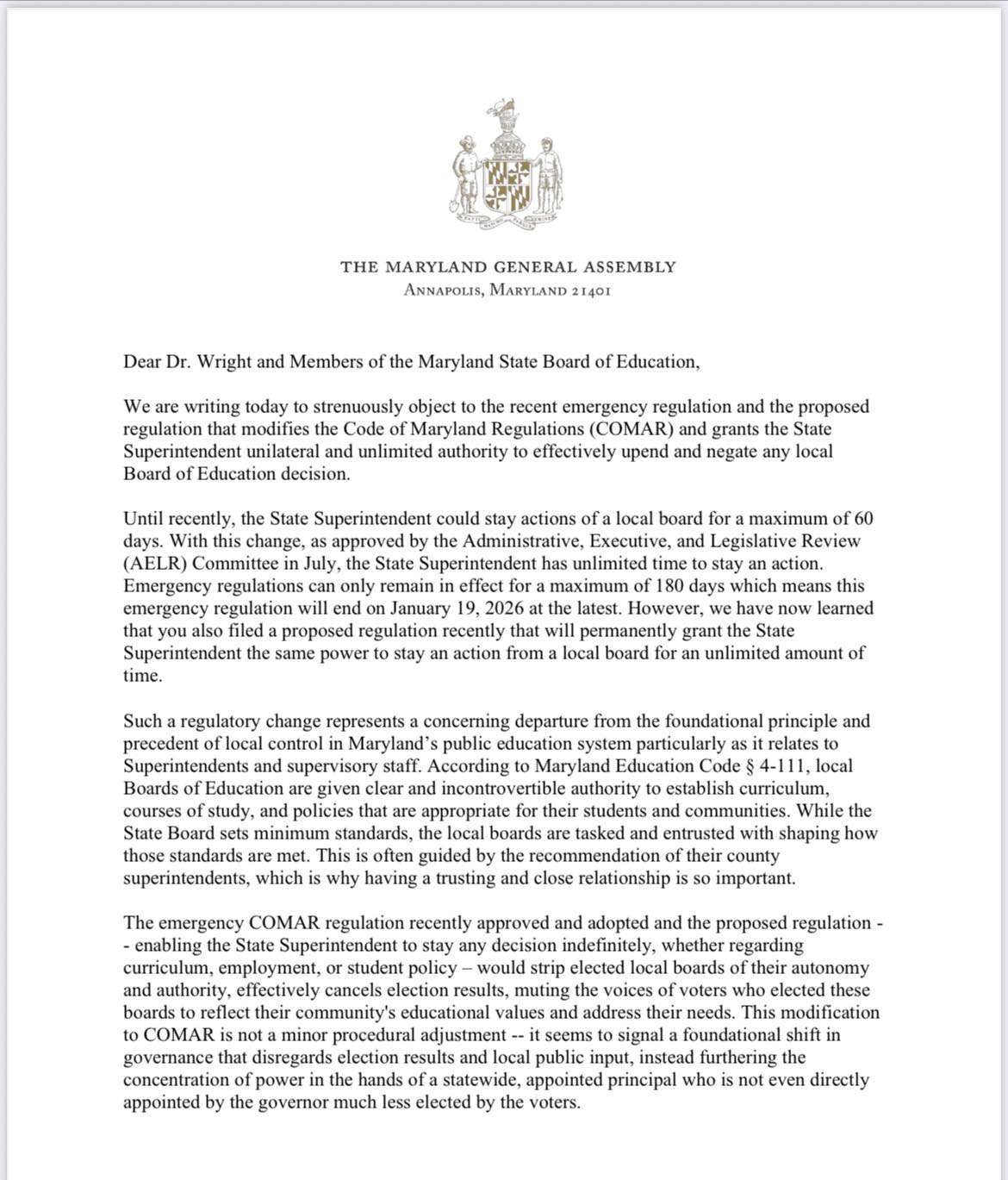 Our District 5 Delegation sent a letter to State Superintendent Dr. Carey Wright and Maryland State Board of Education strongly objected to the recent emergency regulation and proposed permanent regulation that would allow the State Superintendent unilateral and authority to effectively halt any local Board of Education decision while that local decision is being appealed to the State Board – including personnel decisions.