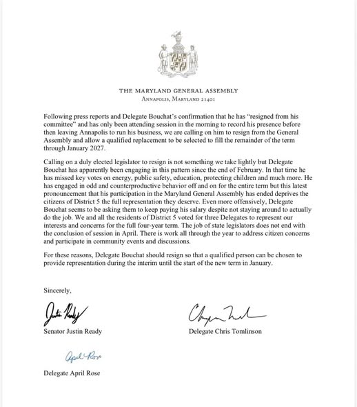 Our other two District 5 Delegates (April Rose & Chris Tomlinson) and I have publicly called on Delegate Bouchat to resign. Our statement is below: