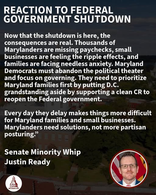 Governor Moore predictably is trying to blame Donald Trump, Republicans, or some combination of the two. However, Maryland’s two U.S. Senators Chris Van Hollen and Angela Alsobrooks could have voted to keep the government open, the federal government which our state is so dependent on. They chose to vote with their party over the needs of the people in our state. Call Senator Alsobrooks ( 202-224-4524 ) and Senator Van Hollen ( 202-224-4654 ) ask them firmly but politely to change their minds and support a clean CR.