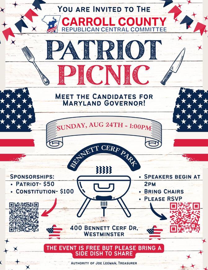 The Carroll County Republican Central Committee is hosting their first ever Patriot Picnic on Sunday, August 24th at Bennett Cerf Park, 400 Bennett Cerf Dr. Westminster, MD. The event begins at 1pm with speakers beginning at 2pm. It is a free event, however the Central Committee is asking that you bring a side dish to share with everyone. For more information, click here.